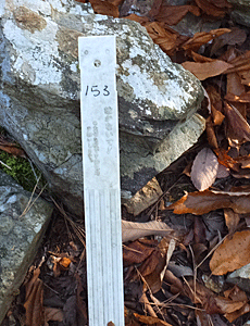 | 石を積み上げた場所にコンクリートの棒 13:16 これと同じものを、いつもの展望地で見ている この道をたどって行けばいいはず・・・と思った 棒にはこんな ↓文字と漢数字が書いてあった |