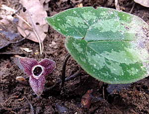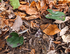 | スズカカンアオイ:ウマノスズクサ科-1 今日は、割りばしとカッター持参 「スズカカンアオイの花を見つけたら、教えてね〜 中を切ってみるから」・・・と言ってある 先頭を歩く植物の会会員が、目ざとく見つけてくれた 早速、枯れ葉や土を退けて、まずその状態で観察 次に2個、花をカッターで切り取って手渡ししながら観察 次に縦切りの花を手渡しして観察 輪切りの花も同じように観察 四角い格子状(アパートの部屋のよう)になっているなんて、「初めて見た!」・・・と ・・・・・・・・・・・・・・・・・・・ これ以後、皆、花目になって(葉っぱ目かな?) ハート型の紋様のある葉っぱを見つけたら、枯れ葉や土を退けて花を探すようになった 十中八九、花が咲いていた 1つだったり2つだったり・・・ |