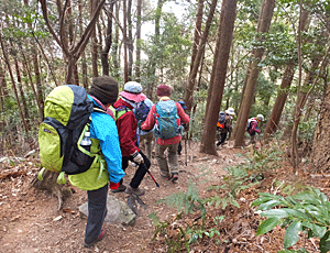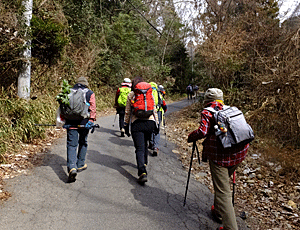 | ずるっと滑りそうな道を注意して下ると、分岐があった 直進なら、今までのような登山道の延長 右折すると、妙な階段(足を下ろす段が傾いている)を下れば沢沿いのたらたら道 各自希望する方を選んで、秋葉神社のトイレで合流することにした |