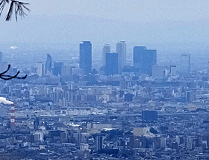 | 名古屋駅前のビルが見える〜・・・と そういえば、今日は展望のいい場所がなかった・・・ 右 ぐっと引っ張りよせてパチリ なるほど、ビル群が見えた |