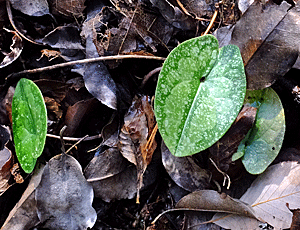 | カンアオイの仲間:ウマノスズクサ科-5 太い木の根のそばで、花をまた見つけた 黒褐色の花も咲いていた |