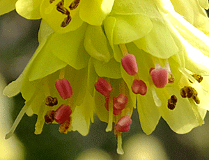 | コバノミツバツツジ:ツツジ科 『雄しべは長短それぞれ5本ずつ 合計10本 雄しべの先端には葯(やく)(花粉の入った袋)が2つある』 ・・・と、書いてあったので、雄しべの先端の葯にピントを合わせて撮影した なるほど、2つがくっついていて、目玉のように穴が開いているのが分かった |