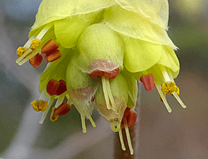| ヒメヤシャブシ:カバノキ科ハンノキ属 上 だらりと垂れ下がっているのは、雄花序 上左 雄花序の少し下に、横を向いた雌花序が見える 上右 垂れ下がった雄花序と上を向いた雌花序はほぼ同じ位置にある ?? 下 昨年の実 |