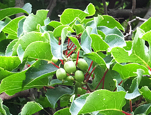 | サルナシ:マタタビ科 確かこの辺にサルナシがあったはず・・・と思って探していたら、 高い木に絡みついていたサルナシの実を見つけた 『雌雄異株または雌雄雑居性のつる植物』・・・? マタタビは雌雄異株だったはず・・・ へ〜え、同じマタタビ科でも違うんだね! これも収穫して、焼酎漬けにして飲んだことがある マタタビの実は生で食べると『非常に辛くて食べられない』そうだが、 サルナシは『熟すと淡緑黄色になり、甘酸っぱく美味しい』そうである ふ〜ん、覚えておこう! |