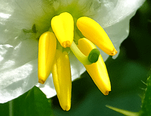 | ワルナスビ(悪茄子):ナス科-1 『北アメリカ原産』 面白いのは、雌しべの長さが違う花があること(緑色が雌しべ) 長い雌しべの花と、短い雌しべの花が、同じ株の中で並んで咲いていることもある 雄しべ(黄色いバナナのような形)の葯の先端には穴があいていて、そこから花粉が出てくるらしい |