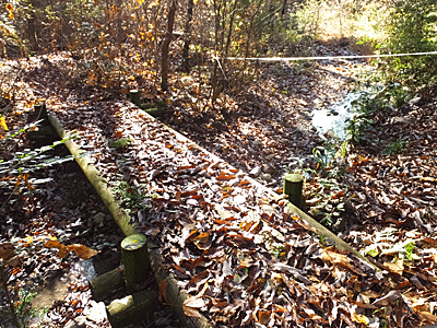 | この木橋を渡る 白いビニール紐が張ってあるのは何の意味? |