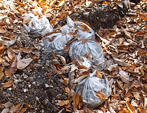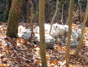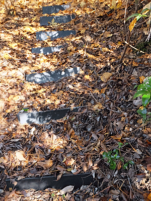 | 橋を渡ると、山道の登りになる 右手に白いビニール袋 ごみ?かと思って近づいてみると、 タイルのようなものが入っていた 何のためだろう?? |