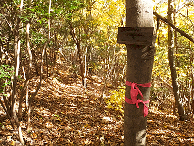 | プッツンが始まった頃は、 ここから先はどこへも行くことができなくて 引き返していたが しばらくすると、縦走ができる道ができていた この赤いテープから・・・ |