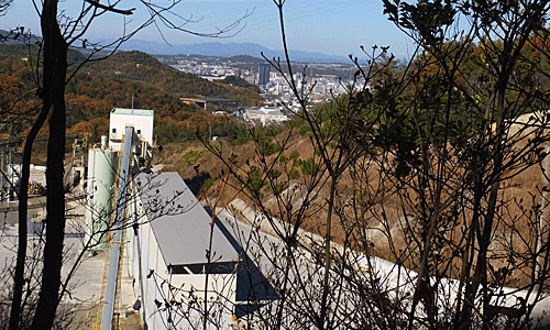 | 三角点を過ぎると、登山道はプッツンと切れ 工場が見下ろされる崖の上になる 以前は、山続きになっていて、 向こうの山の鉄塔まで通じていた |
