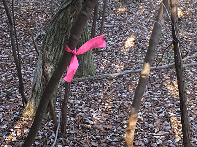 | この道は、地域の人の散歩道らしく あちこちでこんなテープを見かけた |