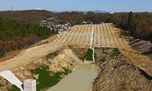 | 足元は、山を削った後に作られた大きなため池 削った後には小さい苗木が植わっていた 山の木を切って造成地にするのかと思っていたが、 また木を植えた・・・?? また山に戻す?? この広場の端をぐるっと回りこめないこともないが 安全を考えていったん山の中に戻ることにした |