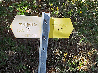 | ↑ 鉄塔のそばに、右方面「大畑分岐線 No.1.2」 左方面「大畑分岐線 No.3」と、手書きの数字が書いてあった |