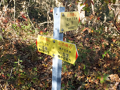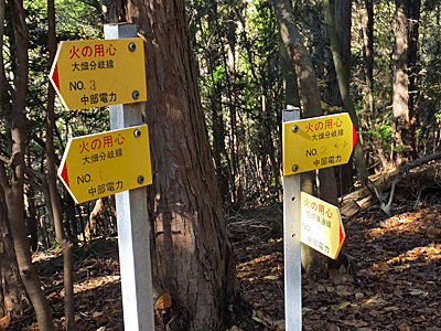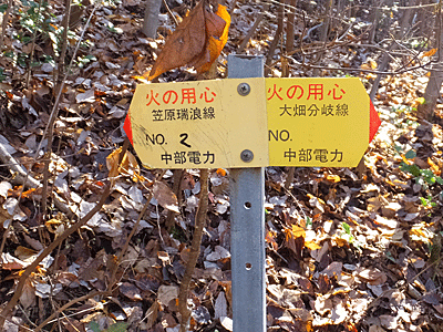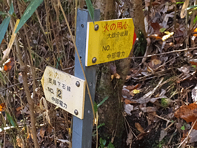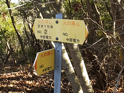 | 近くにあった中電の表示板を見ると、 またまた文字が消えていた 今まで消えていたのは、「大畑分岐線」だったので これも多分そうだろうと思った 以前の記憶ではここから右折すると、お地蔵様方面や 舗装路へ下りた後「滝呂緑地」へ行けた 真っ直ぐ行くと、笠原方面へ行けるはず 直進! |