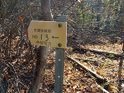 | 鉄塔「No.2」のそばには、こんな表示板 「大畑分岐線 No.1 3」は反対側ってことね |