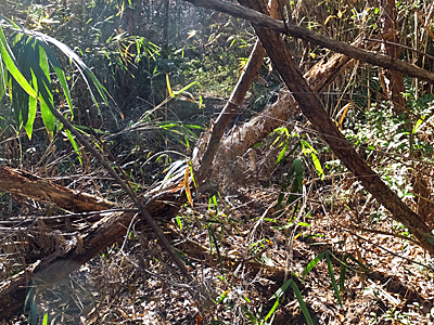 | 倒木地帯の次は、ヤブ地帯 なんとなく踏み跡がある場所へ足を踏み入れた |