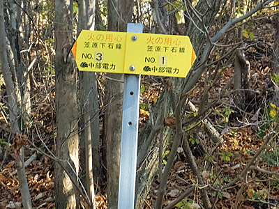 | T字路を左折すると、尾根の左下に鉄塔が見えた 傍に、中電の表示板があり、 左へ行くと「笠原下石線 No.3」 右へ行くと「笠原下石線 No.1」と、書かれていた 「大畑分岐線」とは違う電線ということになる ↓ つまり、この鉄塔は「笠原下石線 No.2」 |