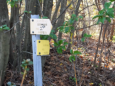 | 下りた所には、こんな表示板 今までいた方向が、「大畑分岐線 No.1 No.2? No.3?」(うすくなって読めない) ここから右折する方が、「笠原下石線 No.2」だね あれ? さっきは、「笠原瑞浪線」だったよ! |