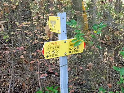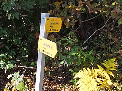| 中電の表示板を見て、またホッとした 鉄塔巡視路に間違いないだろうけれど、 こんなひどい巡視路も珍しい 中電のスタッフは、どの道を歩いているんだろう? もう、歩くのは止めて、ドローンで巡視しているのだろうか? |