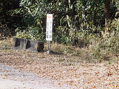 | 舗装された広い車道に出た ↑ この白い看板の所へ出てきた 振り返ってパチリ |