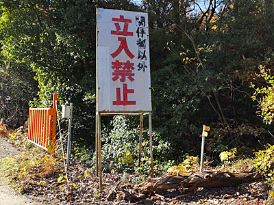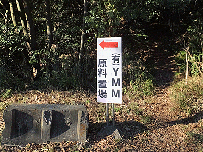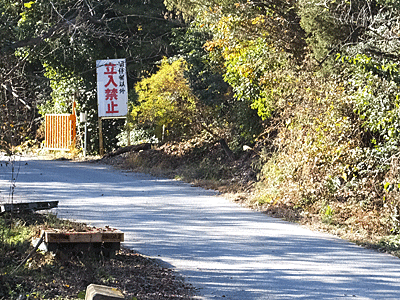 | その車道は、「前田陶料」という大きな会社の中へ続いていて 「関係者以外立入禁止」の大きな看板とゲートが見えた |