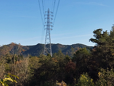 | よく手入れされた遊歩道的な道を登ると すぐ、尾根に出た 前方に鉄塔 |