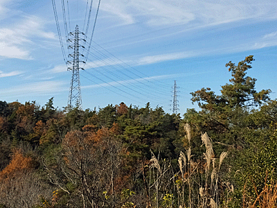 | 後ろを振り返ると、さっきまでいた鉄塔 奥の鉄塔で、高圧電線が分かれている え~?どれがどの鉄塔か、分からなくなってしまった~! |