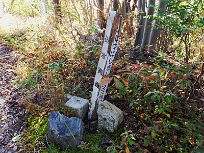 | またまたまた二俣 今までの二股は左右どちらから行っても合流できるが ここだけは必ず左へ行かないと 元の「おりべ砂防ダム」へ行けなくなる (ま、遠回りになるが、まったく行けないわけではない) 目印は、手前の棒! |