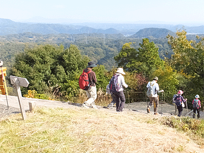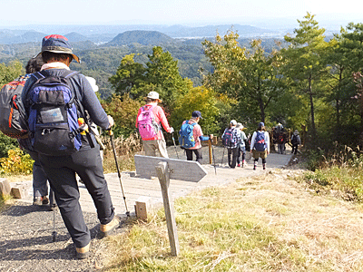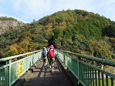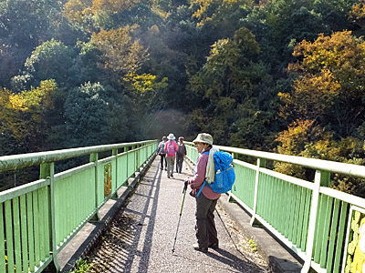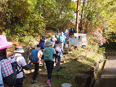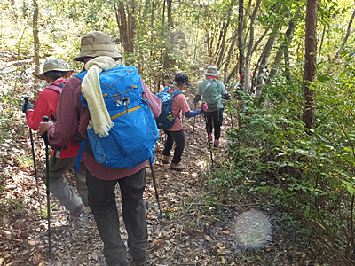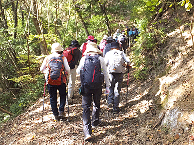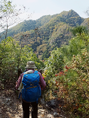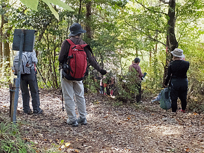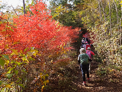 | 目の前の山は、いったん富士見橋まで下りたら また登り返す山 途中、「お〜い、お〜い」という声が聞こえたので 何だろうと思いながらも「お〜い」と返したが 先に事情があって下山した人の呼びかけだったと後で分かった (彼女は、速足で高木山へ登って下りて帰った…と、 後から連絡があった) |