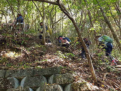 | 半分くらい食べてお腹をなだめ、出発 12:10頃 急な下りなので、細心の注意がいる 事情がある人は、ここで皆と分かれて下山することになった |