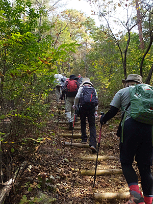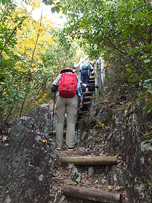 | 渡り終わるとすぐ、急登が始まった 「ふらっとしたら、左へ倒れないで右側に倒れて」と 冗談ぽく注意したほどの、左は急な崖 |