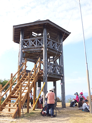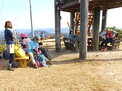 | 「100m」に励まされて、山頂着〜 11:05 先行グループはすでに到着して めいめい座ったり、お喋りしたりして休憩していた 椅子に座っていた人たちに、 「1人分あけて〜」と言って、後から登ってきた人を座らせた |