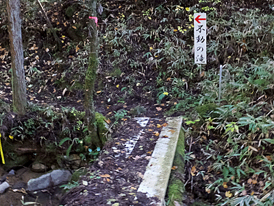 | ここから「不動の滝」へ下りて行けるが、 水量が少ないと「滝」らしくない ↓ |