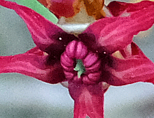 | 花の中央にある白く透明のような部分が雌しべ ↑ 雌しべの先端は2つに分かれている この頃はまだ雄しべの花粉がでていないので 雌しべ先熟 |
