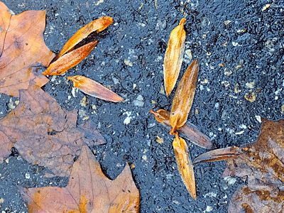 | 落ち葉がいっぱい! 葉っぱを見ると、ユリノキの大きな葉っぱだった 左 上を見上げると、葉っぱ無しで実だけが残っていた 右 実の中の種は落ちてしまっているかも・・・ 次は、反対側のBゾーンヘ |