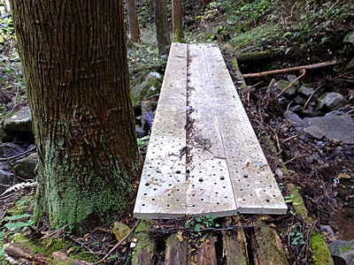 | 沢を渡ったら左折 丸い穴の開いた金属の橋 とても滑りやすい ここも全員集合場所にしよう |