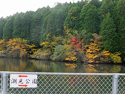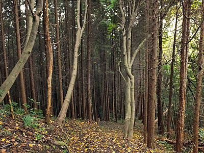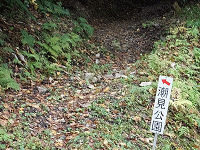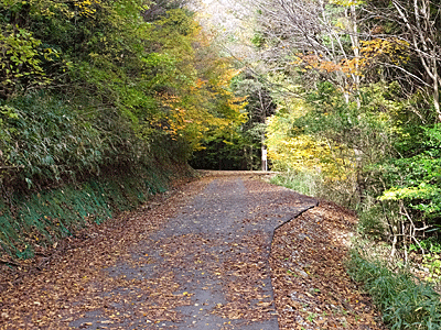 | 堰堤を乗り越えたら、落ち葉いっぱいの道になる ↓ | |