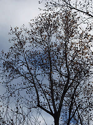 | 足元にモミジのような葉っぱが落ちていたが モミジより大きめ 見上げると ↓ モミジバフウの樹 殆んど葉っぱが落ちてしまっていた |