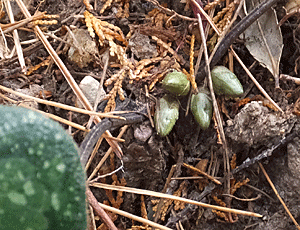 | スズカカンアオイ:ウマノスズクサ科 緑色の固いつぼみが顔を出していた 落ち葉の下や、土の中の方が暖かいのに・・・ |
