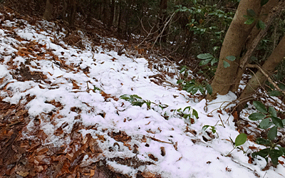 | 登るにつれ、落ち葉の上の雪が増えてきた |