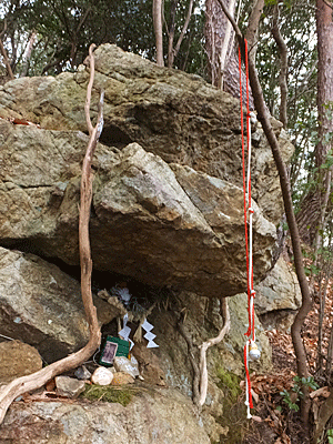 | 通常ルートを避け、 山の中の道を下りていくと 赤と白の紐と鈴があった なんだろう・・・と近寄っていくと、 しめ縄と「しで」があり、お供え物があった |