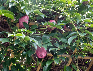 | ムベ:アケビ科 隣のアケビは、実は一つも無し このムベは、10月頃実ができるというのに、 まだたくさんぶら下がっていた |