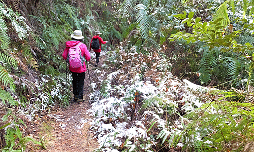 | 昨日の雪は、道路はきれいに融けていたが 山に入るとこんな感じ 駐車場まで来る途中の道路脇 気温表示は、0℃! 葉っぱや草の上に積もった雪は ふわふわ雪で、なかなか綺麗 登山道の雪は、凍ってはいなかったが 足元に注意して歩いた |