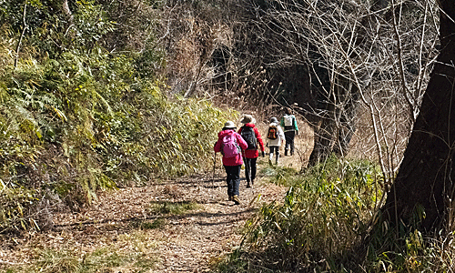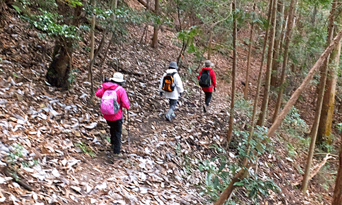 | 道標No.33を左折すれば 植物園方面だが、 それではすぐ林道歩きとなって 余りにもあっけなさすぎるので直進〜 11:16 また分岐があったが、 ここでわざわざメインロードではない道を選んだ 雪や凍結の心配はなかったが、 「イノシシロード」という名前がぴったりする 畑を耕したように掘られているワイルドな道だった 1人だったらこういう道は選ばないが、 今日は5人もいるので気を強くして歩いた 途中、薄い踏み跡状になったが 経験豊かな先頭は、 時々スマホを見ながらも、確実に道を選んで行った だんだん踏み跡がしっかりしてきて・・・ ウラジロが現れるようになると ↓ 登山道らしくなった |