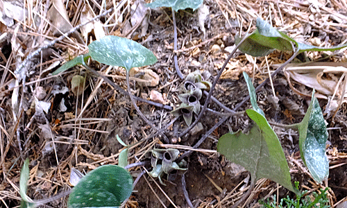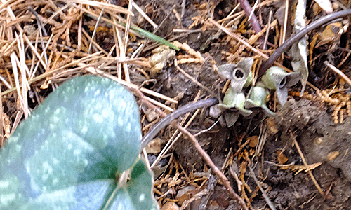 | スズカカンアオイ:ウマノスズクサ科 行きには雪で隠れて見えなかった場所 ふわふわ雪は融けて、 特徴あるハート形の葉っぱが見えるようになった ↑ ↓ ここの株の花はいつ見ても緑っぽい |