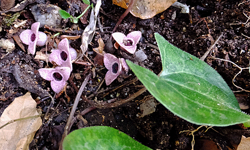 | ヒメカンアオイ:ウマノスズクサ科 花びら(本当は「萼」)の開き方が スズカカンアオイとは違う 「半開」くらい |