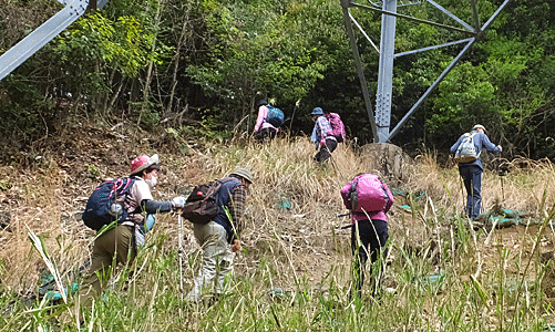 | 疲れた〜 汗びっしょり〜 やっと着いた鉄塔下 9:13 全員集合場所のA ここから尾根に出て右折する |