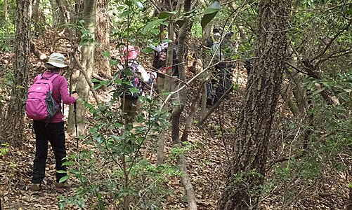 | 広く歩きやすい道を登って山頂着 10:38 全員集合場所のC 山頂は見晴らしが無いので すぐそばの展望地へ 10:50出発 |
