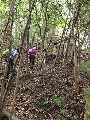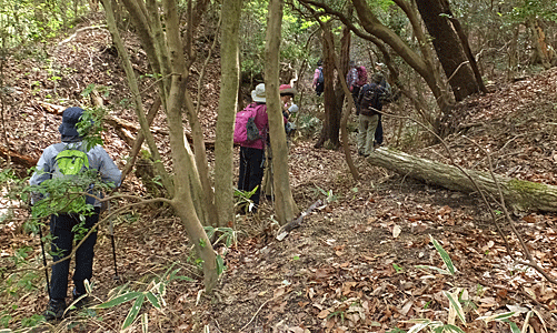 | 尾根は、登りあり・下りあり・たらたらありだが、 落ち葉の積もったふわふわ道は、 歩きやすく楽〜 |