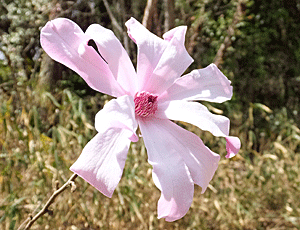 | 沢沿いに群生 尾根には1本も無し 花びらの数はいろいろ 『9-25枚』という説もある 『1つ花の開花期間は約10日で、 株全体では20日間程度開花する』・・・とか ( 『希少樹種の現状と保全』↓からお借りしました https://www.ffpri.affrc.go.jp/labs/raretree/index.html 下左 裏側はかなり濃いピンク色 しかし、正面から見ると、白っぽい 鼻を近づけると、良〜い香り |