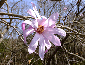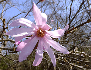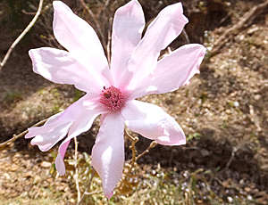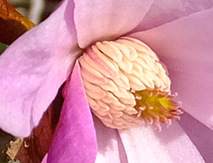 | シデコブシ:モクレン科-1 シデコブシは雌しべ先熟 中央にあるのが雌しべ 外向きに出ているのが柱頭 その周りを取り囲んでいるのが雄しべ |